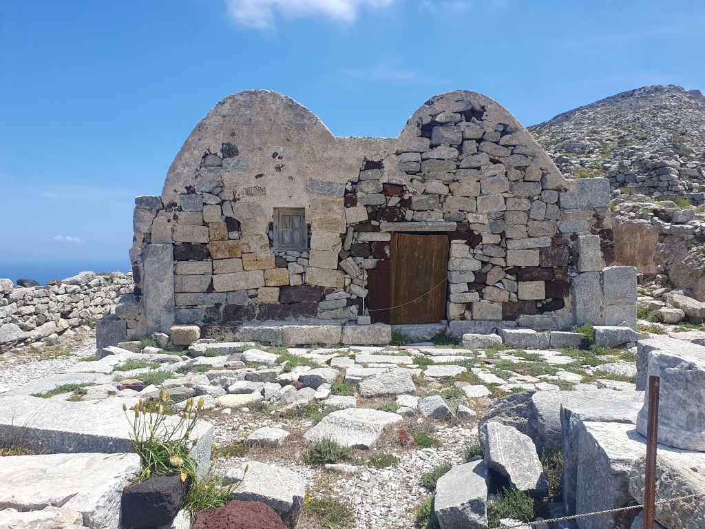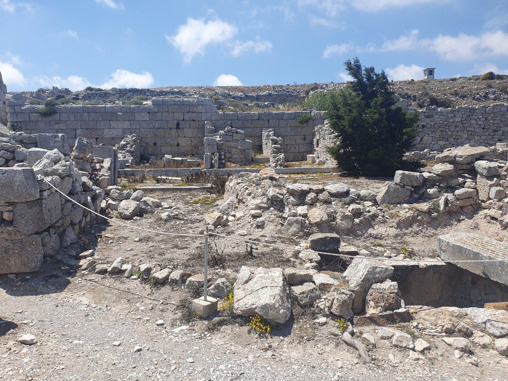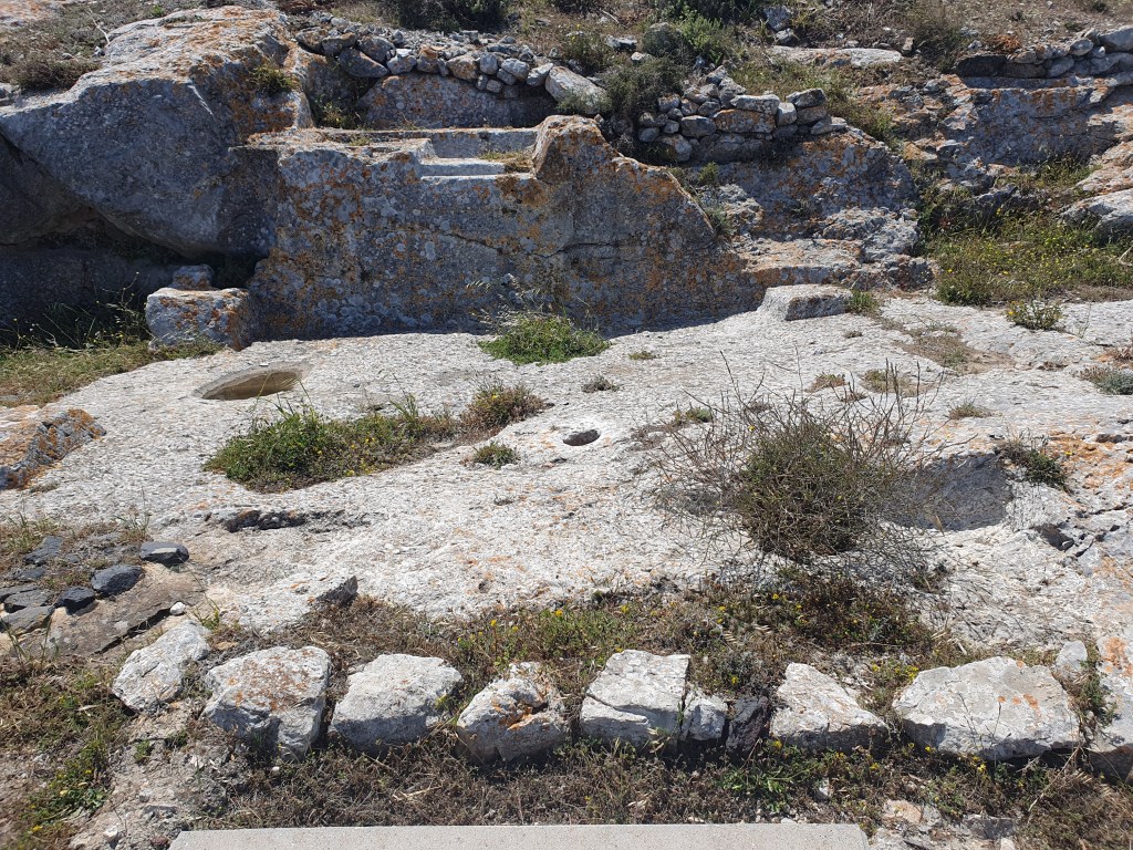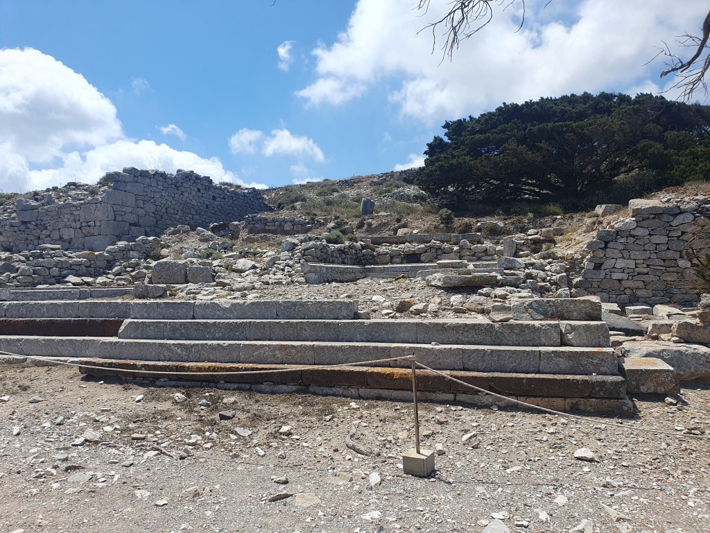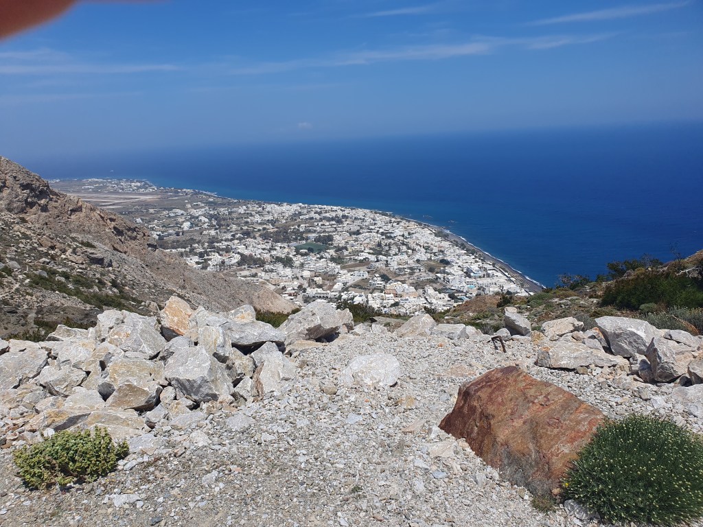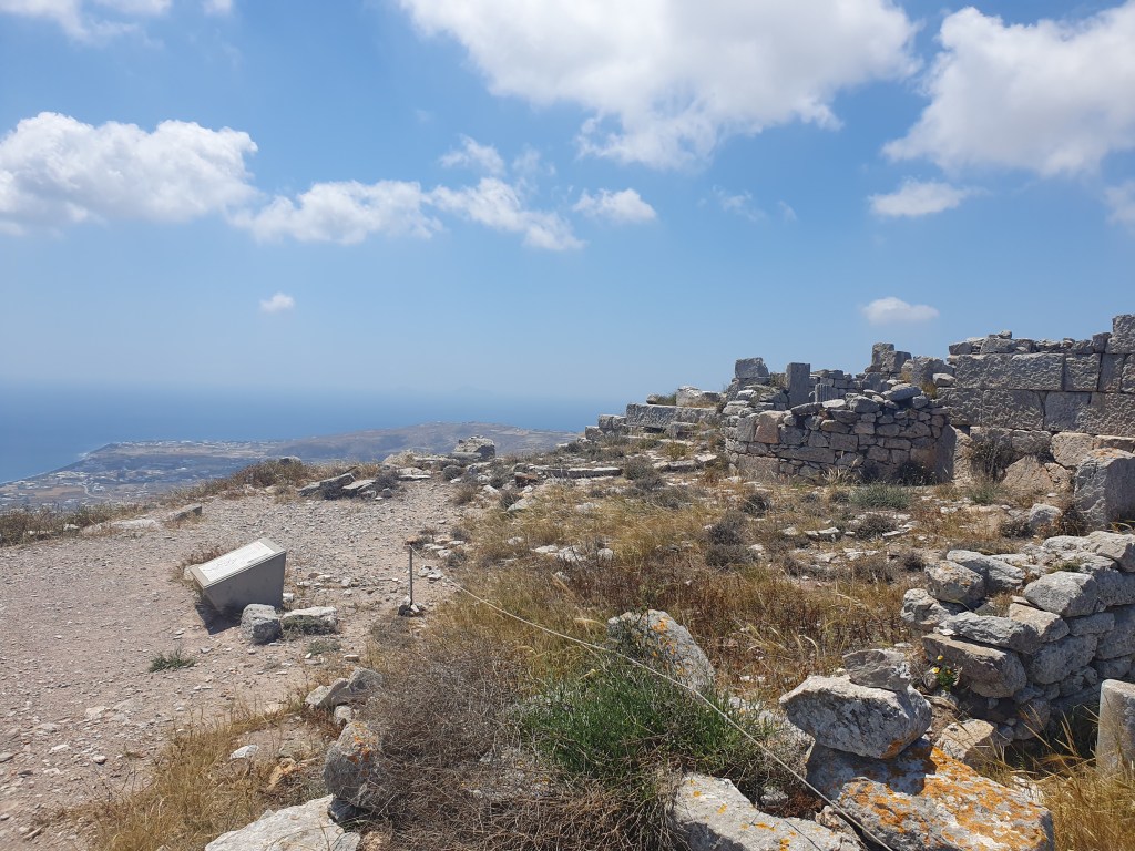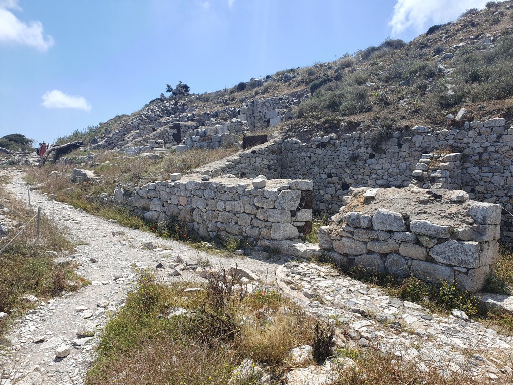 There is a massive rocky mass in the middle of the main islands, and right near the beach was a steep incline leading up to the Ancient City of Thera. The path upwards was a zigzagging steep road that went one way then the other as it climbed up. It was quite the ordeal to walk up but I, newly athletic because I woke up that way, persevered. Once up there, it was very interesting to see the recovered remains of the ancient city, putting me in mind of the earliest levels of the first Tomb Raider.